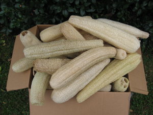 We are now stocking a couple of loofah items from Egypt for sale, compressed whole loofahs and 6 inch sections. Nice quality fiber. They are flat as a pancake and once they get wet expand back into shape.